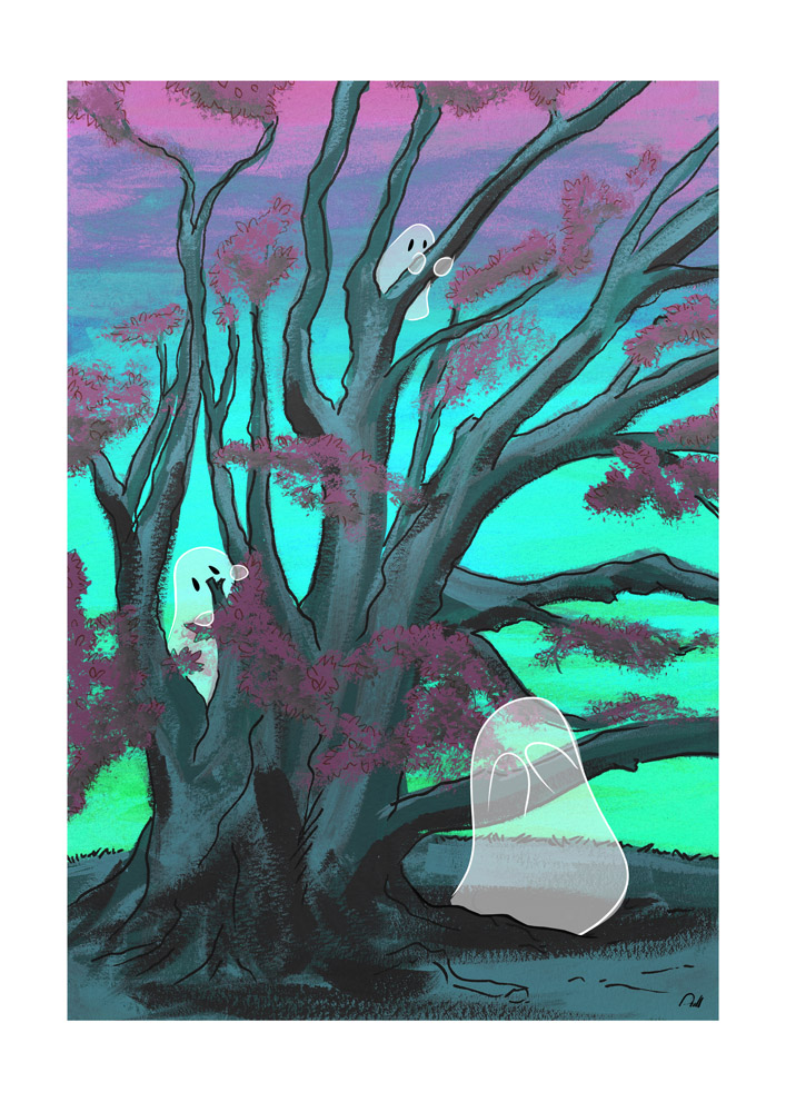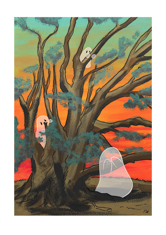This piece was an idea that popped into my head after seeing a particular tree whilst out on a walk. Ghosts playing hide and seek. I decided on two versions. The original painting colours are closer to the Sunset version.