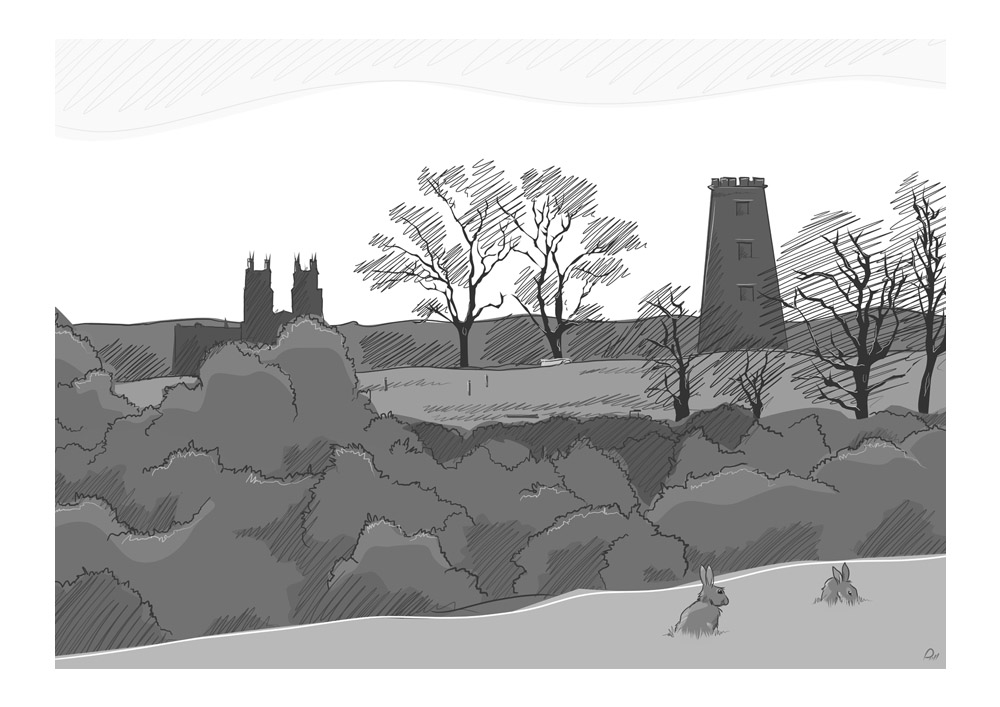 Westwood – 3 Animals, Buildings, Objects A 3rd piece showing The Westwood in Beverley. This piece shows both The Minster and The Black Mill in the background with some Rabbits in the foreground. Related